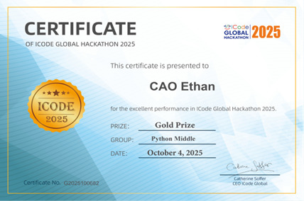 We are pleased to announce that 1A Cao Ethan won the Gold Prize in the Python Middle Group of ICode Global Hackathon 2025 organized by ICode Foundation.