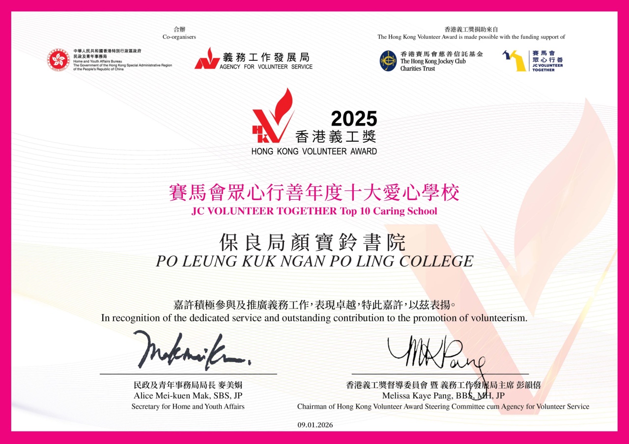 Po Leung Kuk Ngan Po Ling College was awarded the “JC VOLUNTEER TOGETHER Top 10 Caring School”.