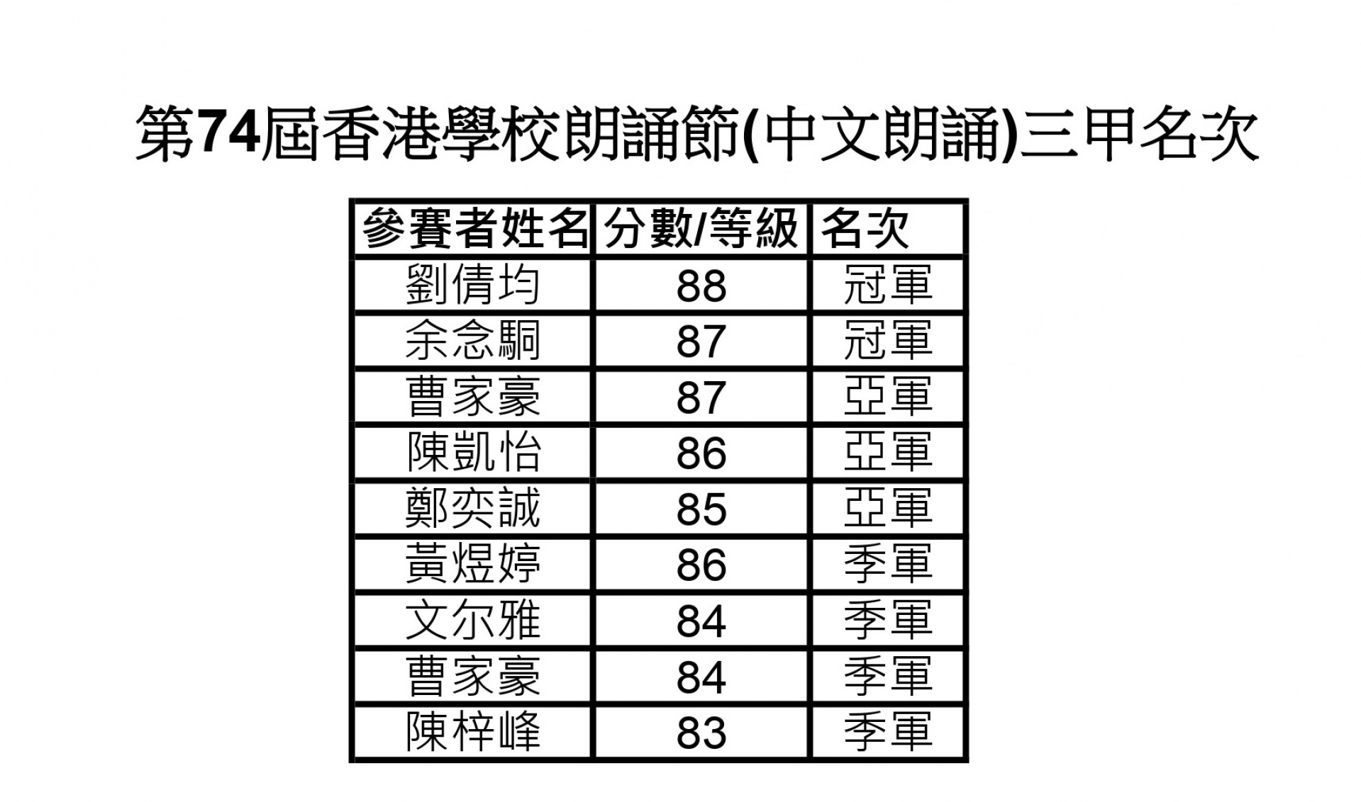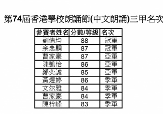 在同學勤加練習及各位中文老師訓練下,喜獲成果:共兩名冠軍、三名亞軍及四名季軍, 三甲名單如下: